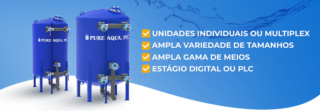 Porquê um filtro de pressão? Os filtros de pressão da Pure Aqua podem ser usados numa diversidade de condições de serviço incluindo, mas não limitado a aplicações industriais, municipais e institucionais. Para problemas com ferro, partículas suspensas, sedimentos, turvação, sabores e odores desagradáveis, coloração indesejada ou outros contaminantes comuns em águas superficiais, os filtros de pressão Pure Aqua são a solução ideal de purificação.
