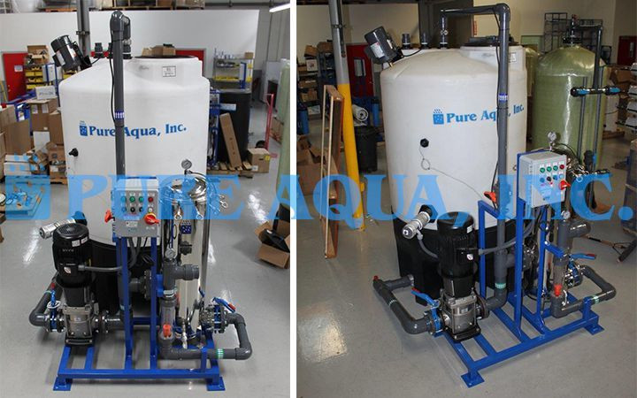 Este sistema de limpeza de membrana foi projetado para uma empresa nos EUA. É capaz de limpar cinco das membranas de oito polegadas simultaneamente a uma taxa de 200 galões por minuto. Incluído no sistema está um grande tanque para misturar a solução de limpeza, que é alimentada por um motor de bomba. Ele também incluiu um mixer e um aquecedor. Este sistema foi selecionado a partir do sistema de limpeza de membrana montada sobre suporte deslizante Pure CS das séries CS.